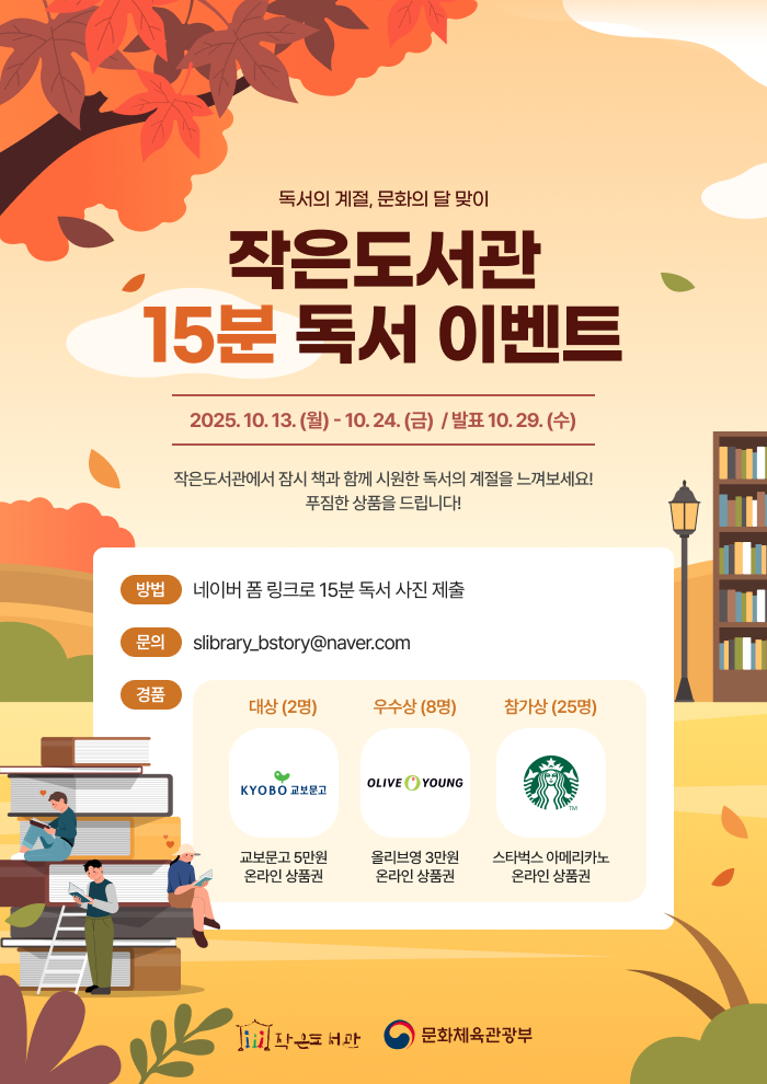 798 | 기타 | [작은도서관통합홈페이지] '작은도서관에서 15분 독서' 이벤트 안내 | 등록일 :2025.10.13 |