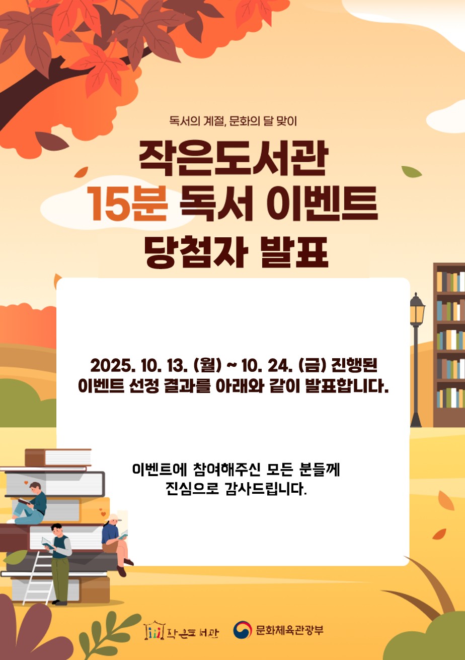 2025년 10월 13일부터 10월 24일까지 진행된 '작은도서관 15분 독서' 이벤트 결과를 다음과 같이 발표합니다.