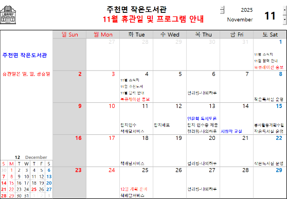 주천면 작은도서관 휴관일 및 프로그램 일정 -25년 11월