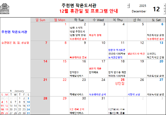 주천면 작은도서관 휴관일 및 프로그램 일정 -25년 12월